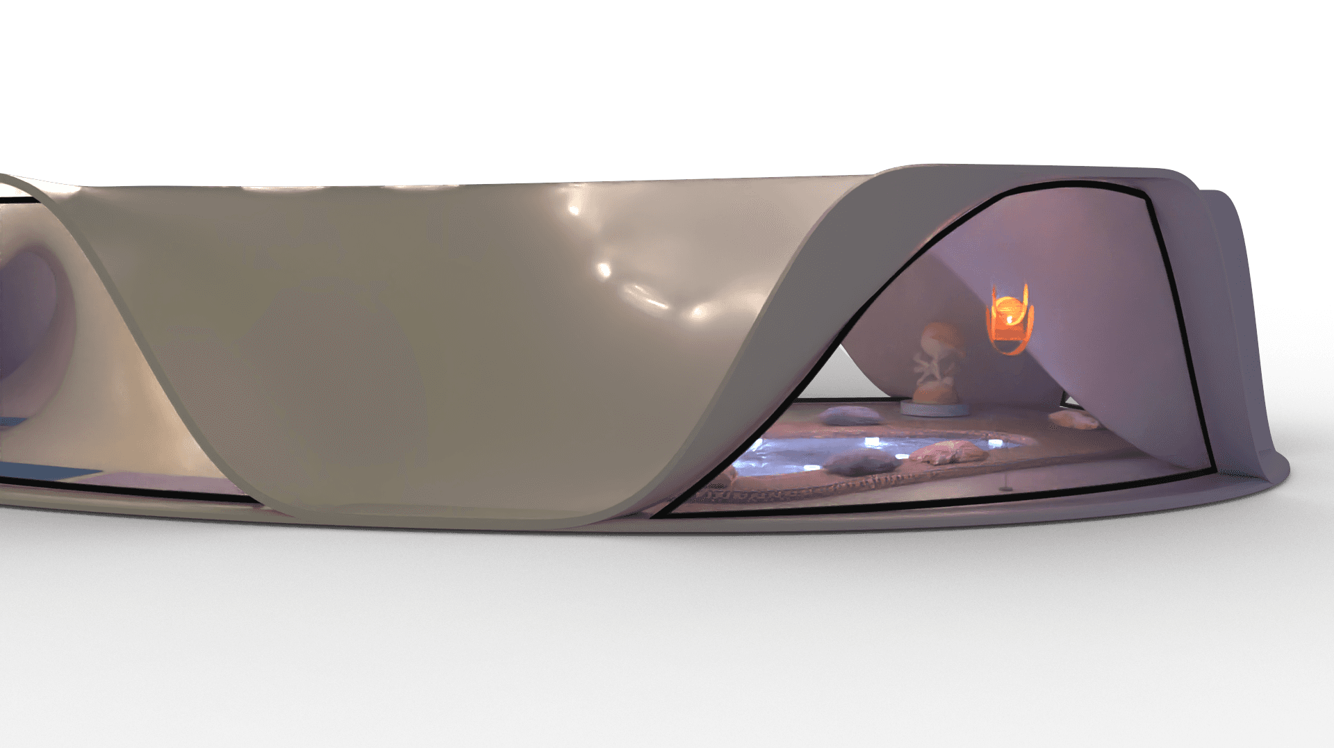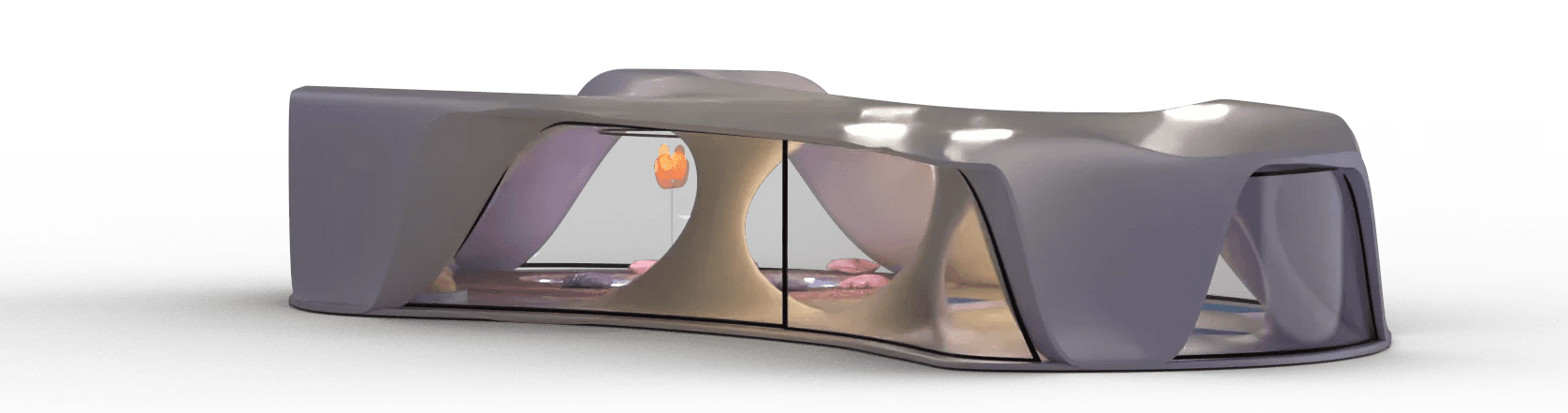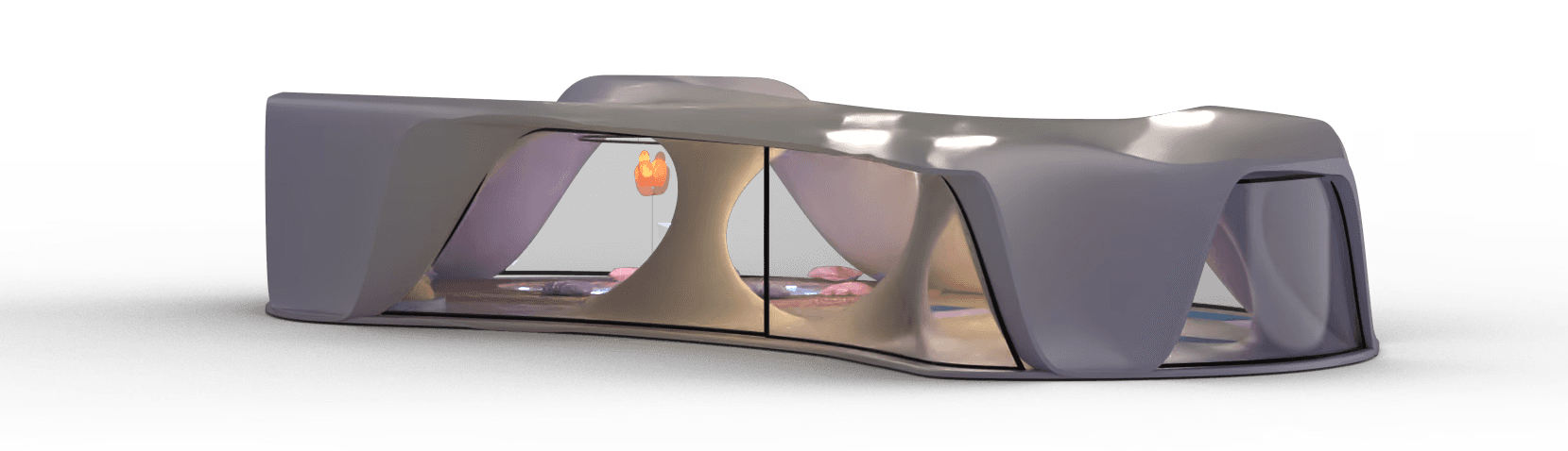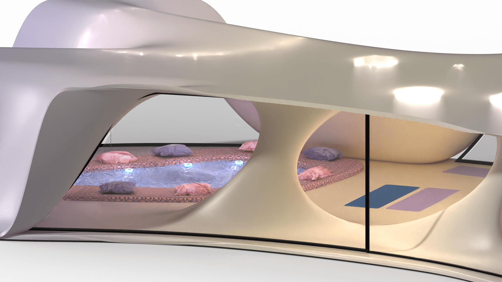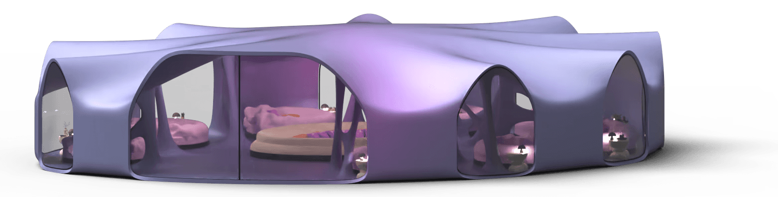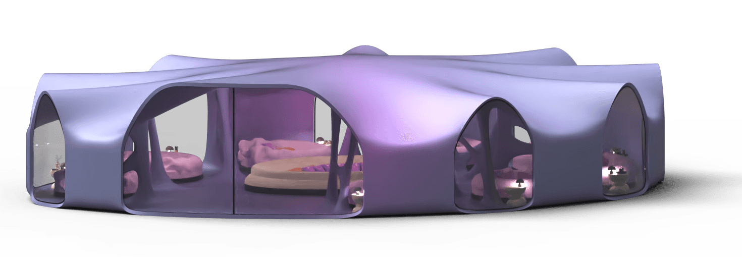 Private sleeping place for the 8 Oneironauts, where they can foster their dreams to create a better future for themselves, a collective lounge area where people can rest together or have talks. Dividers that give you privacy and windows allowing for natural lighting.