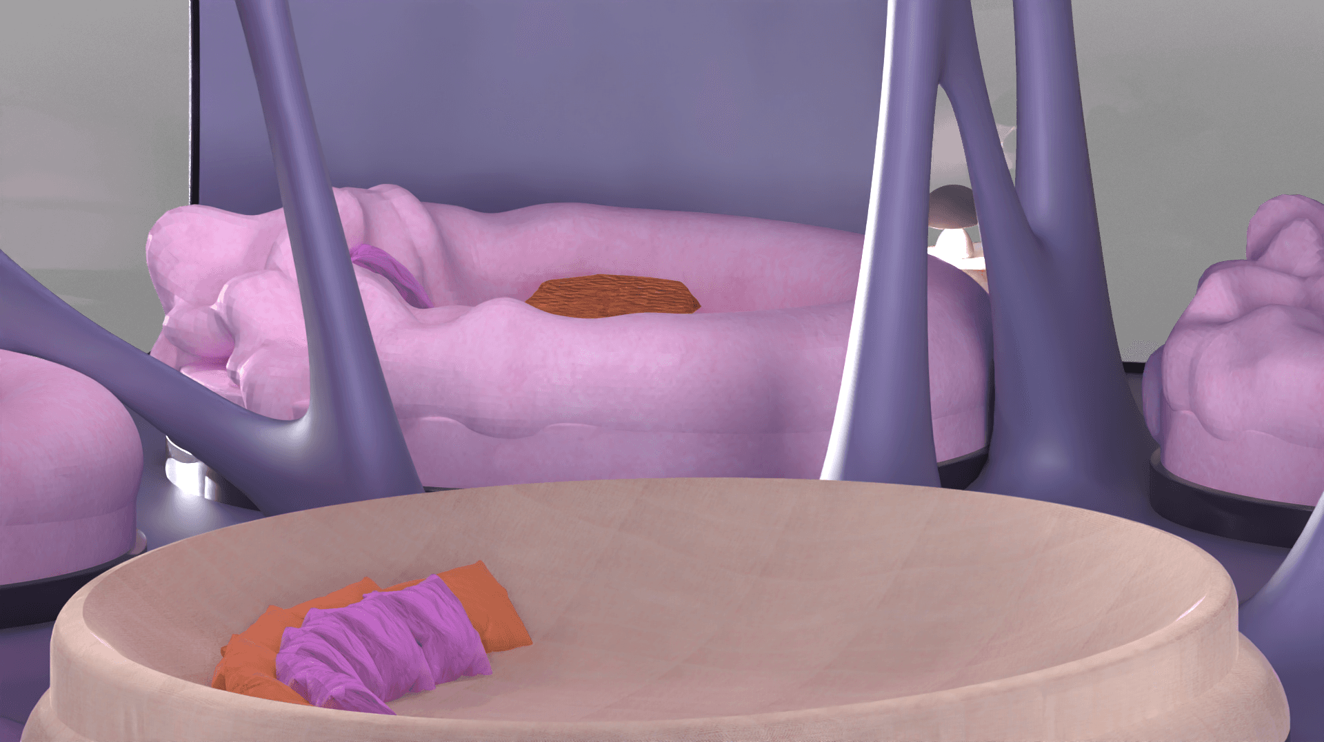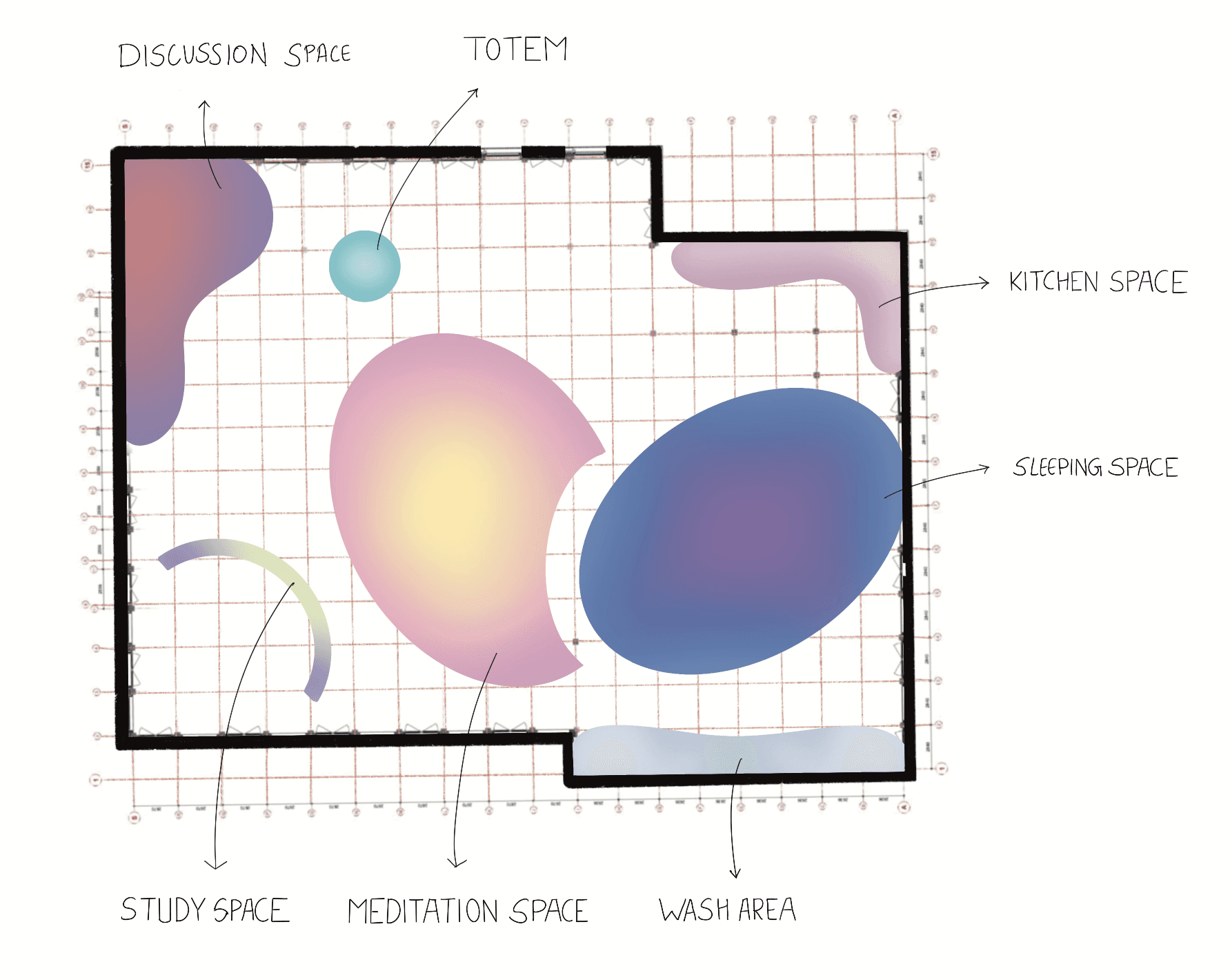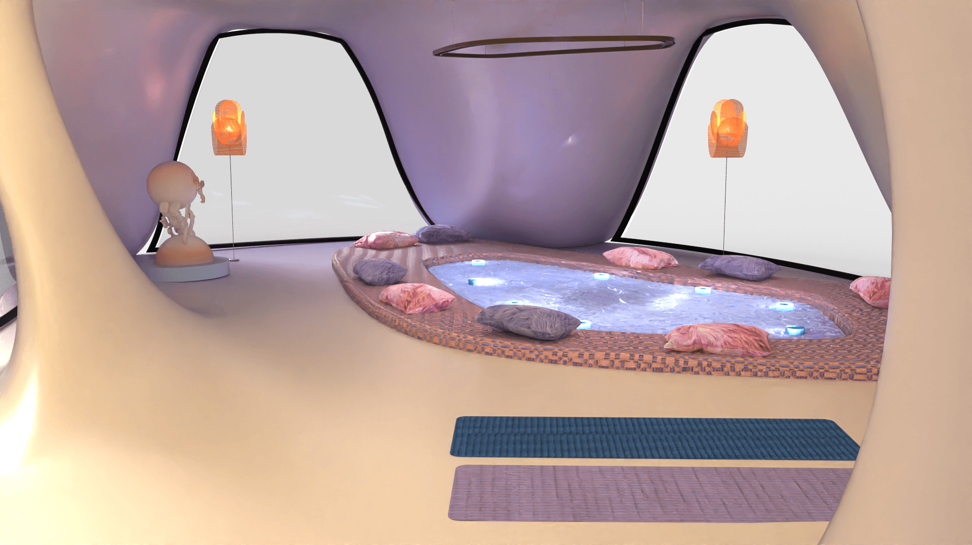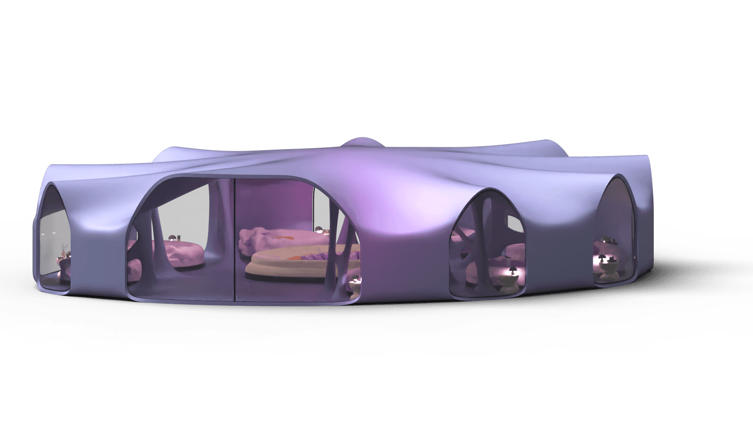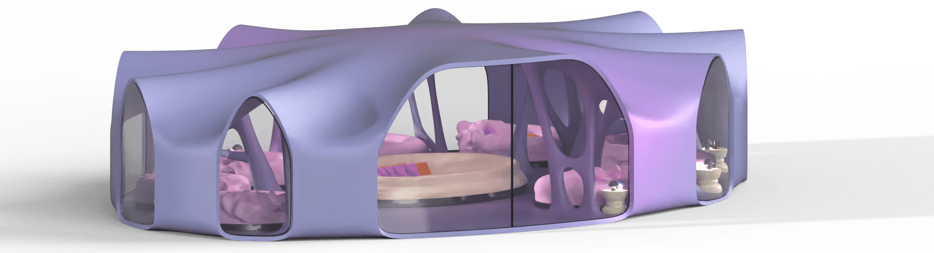 Private sleeping place for the 8 Oneironauts, where they can foster their dreams to create a better future for themselves, a collective lounge area where people can rest together or have talks. Dividers that give you privacy and windows allowing for natural lighting.
