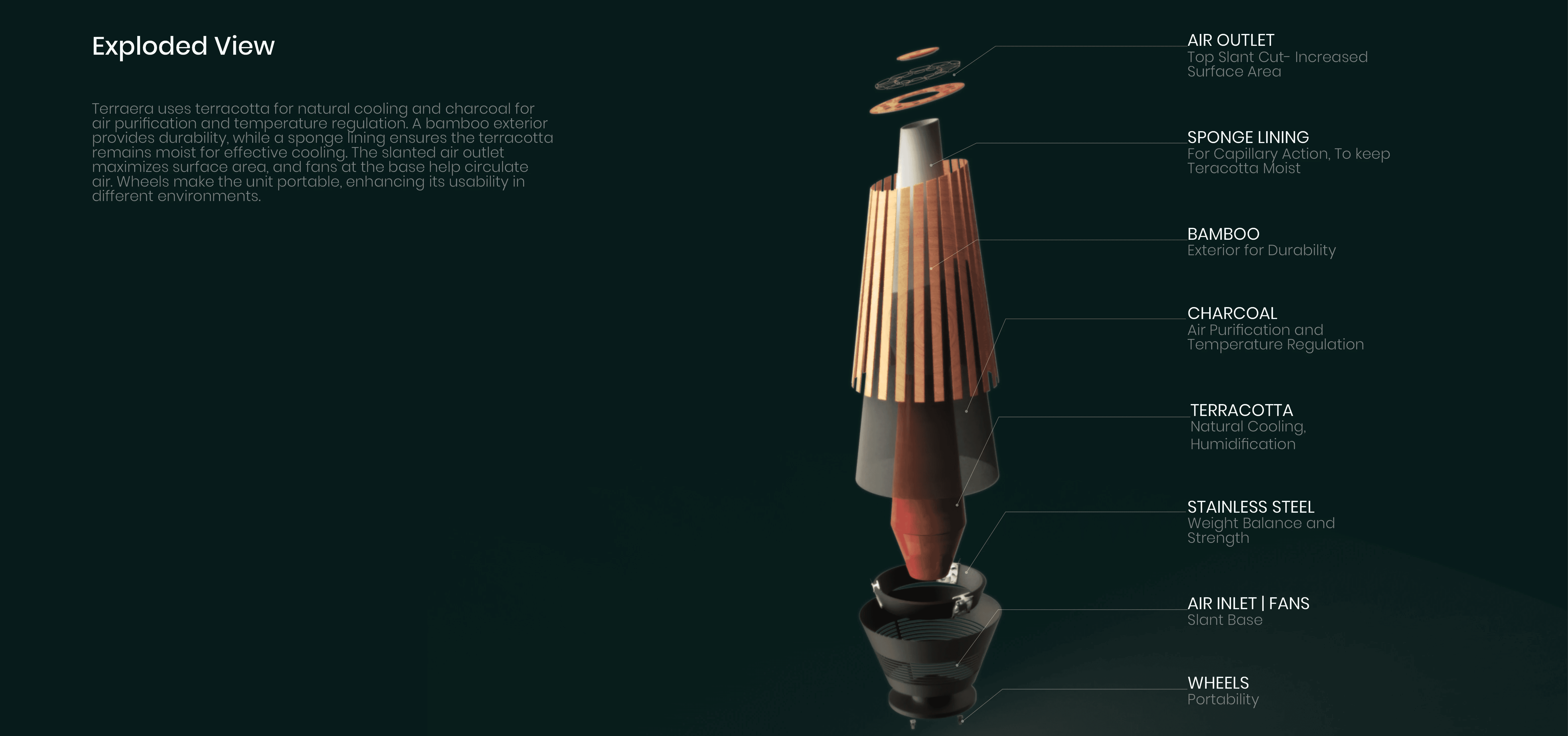 Designed to redefine sustainable cooling. Crafted with natural materials like Terracotta, Bamboo, Charcoal and Metal, Terraera combines timeless cooling principles with modern functionality. Purifying air and creating a refreshing ambiance, both indoors and out, for residents of Southern Italy, who suffer from dry summers.