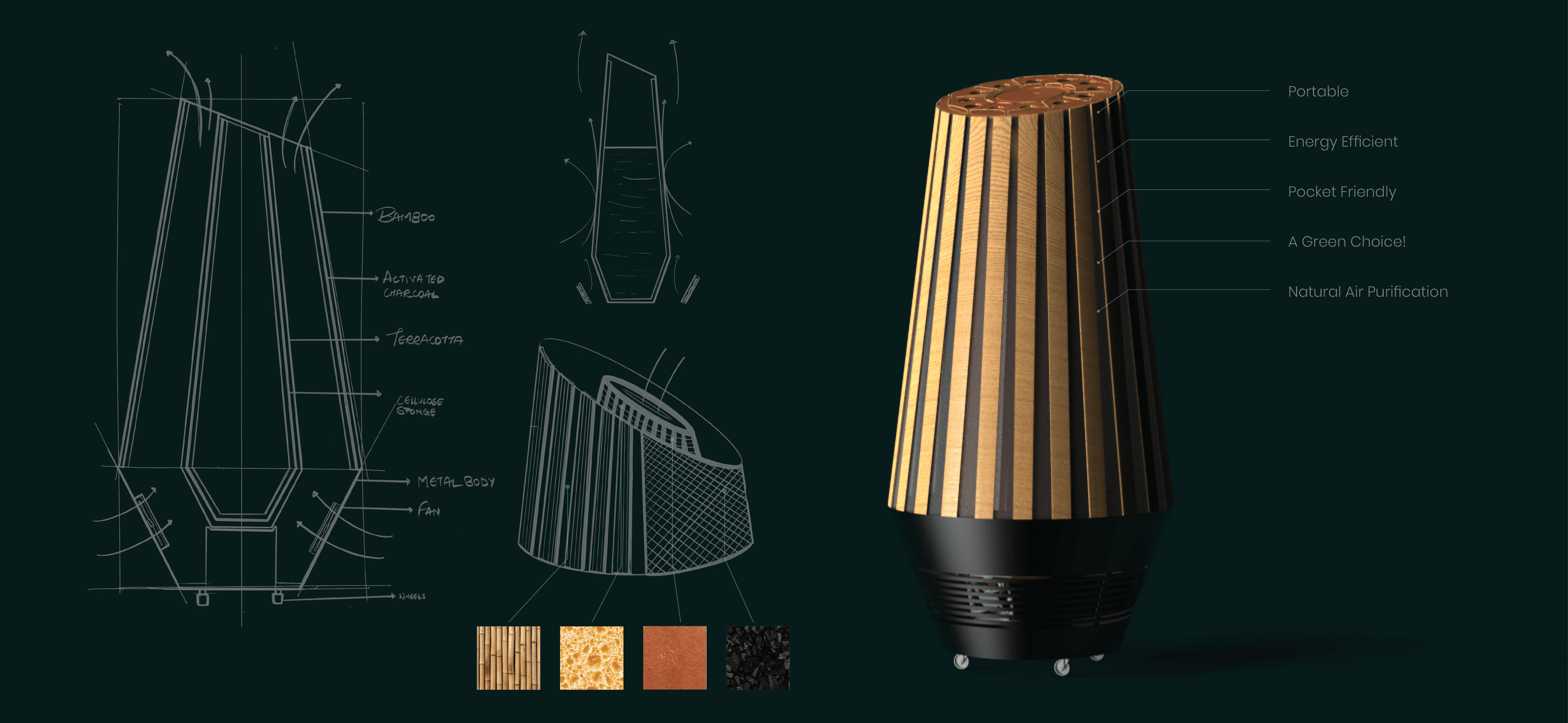to conserve energy using natural cooling methods. Inspired by processes like the Venturi effect and shishi-odoshi, we designed a bamboo frame with charcoal for purification. Evolving into a portable floor cooler with wheels, The product embodies eco-friendly innovation and sustainability.